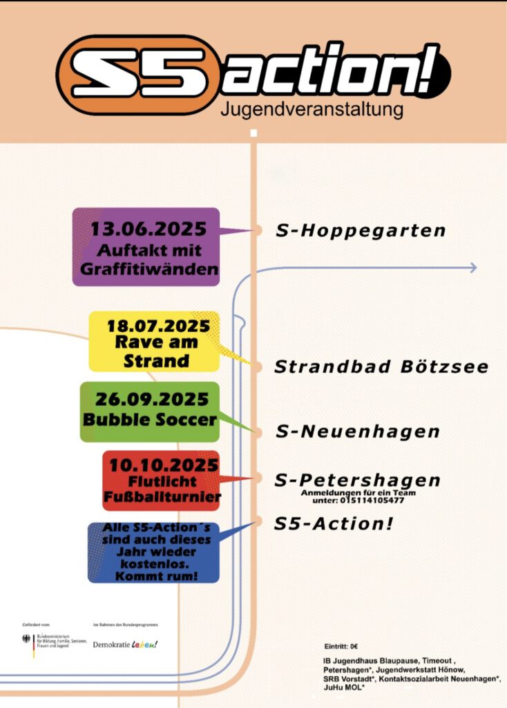 Auch in diesem Jahr gibt es die beliebten S5 – Actions wieder! Am 10.10. findet die S5-Action bei uns in Petershagen auf dem Gelände der FAWZ statt. Das diesjährige Highlight ist ein Flutlicht Fußballturnier, bei dem es natürlich auch Pokale zu gewinnen gibt:)