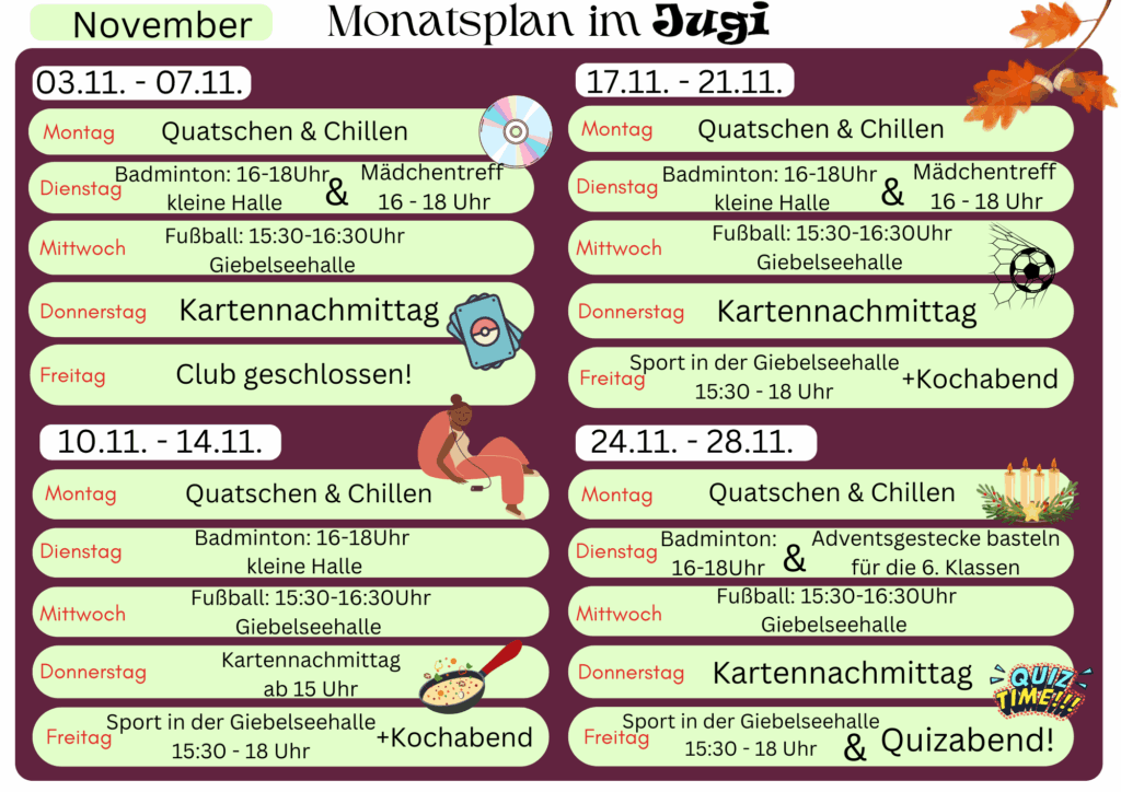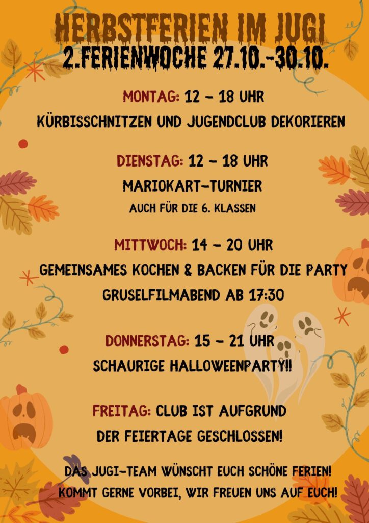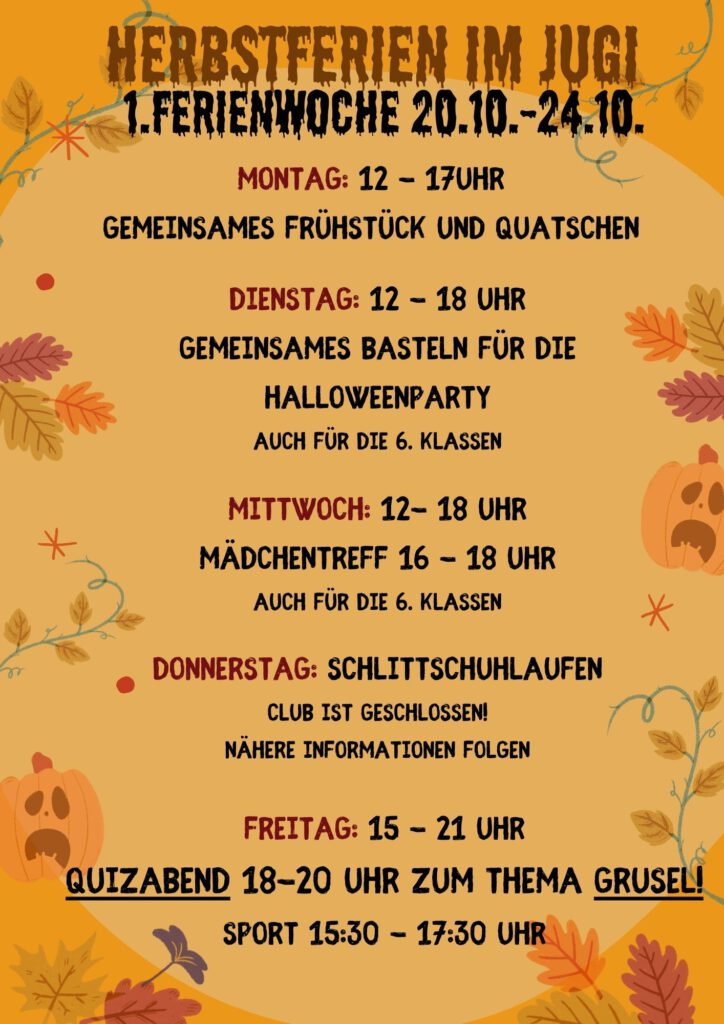 Die Herbstferien stehen bevor, und natürlich haben wir auch für diese Ferien ein Programm für Euch geplant. Am Ende der Ferien erwartet Euch eine schaurige Halloweenparty mit Snacks, Musik und einer Menge Action! Kommt gerne vorbei, wir freuen uns auf Euch!