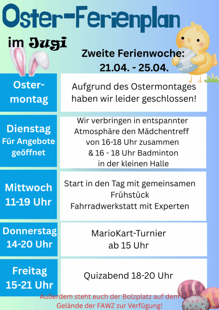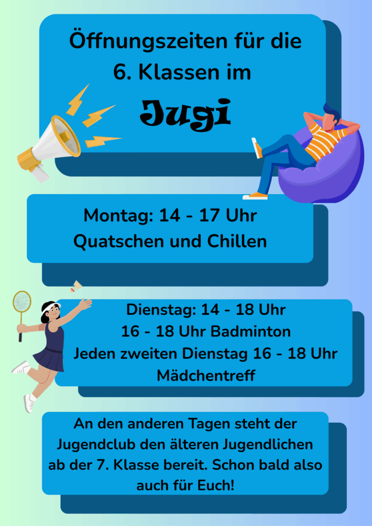 Wir haben bei uns im Jugi jetzt feste Öffnungszeiten für die 6. Klassen! Jeden Montag und Dienstag könnt ihr gerne vorbeikommen und beim Mädchentreff oder am Badminton teilnehmen. Natürlich könnt ihr auch einfach bei uns chillen und Euren Tag ausklingen lassen. An den anderen Tagen steht der Jugendclub den älteren Jugendlichen ab der 7. Klasse bereit. Schon bald also auch die anderen Tage für Euch! 🙂